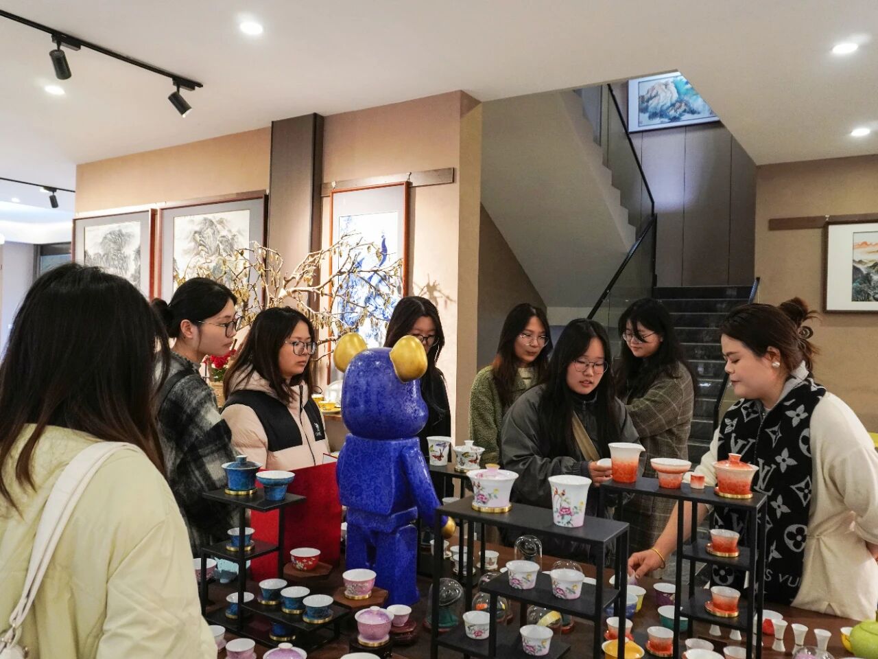 展覽區(qū)內(nèi),琳瑯滿目的陶瓷精品讓學(xué)生們駐足驚嘆。從典雅的青花瓷到絢麗的顏色釉,從精致的日用瓷到獨(dú)具創(chuàng)意的藝術(shù)擺件,辰天陶瓷展現(xiàn)了陶瓷藝術(shù)的多元魅力。負(fù)責(zé)人詳細(xì)講解了不同品類(lèi)陶瓷的制作工藝與文化內(nèi)涵,并現(xiàn)場(chǎng)解答學(xué)生們關(guān)于設(shè)計(jì)靈感、市場(chǎng)定位等問(wèn)題。