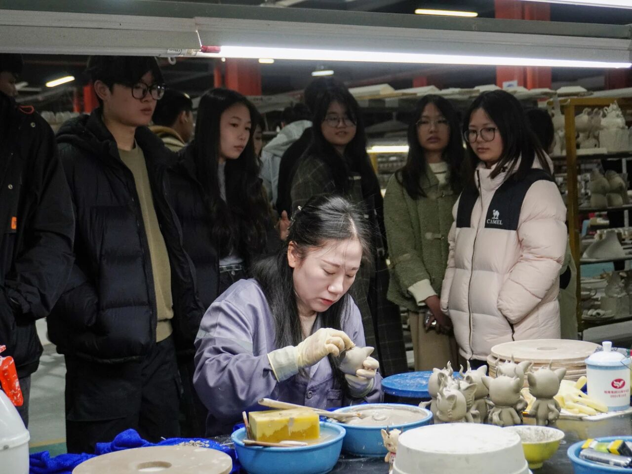 走進(jìn)生產(chǎn)區(qū),學(xué)生們目睹了陶瓷從原料成型到燒制出窯的全過(guò)程。在拉坯師傅的巧手下,器物線條愈發(fā)流暢;后又見(jiàn)證了操作員調(diào)色、施釉,在精細(xì)的操作中,坯體煥發(fā)出別樣光彩;以及于素胚之上巧運(yùn)靈思、妙筆生花的畫(huà)坯等工序后,企業(yè)技術(shù)人員還介紹了現(xiàn)代化生產(chǎn)設(shè)備如何與傳統(tǒng)工藝結(jié)合,提升生產(chǎn)效率與產(chǎn)品品質(zhì)。